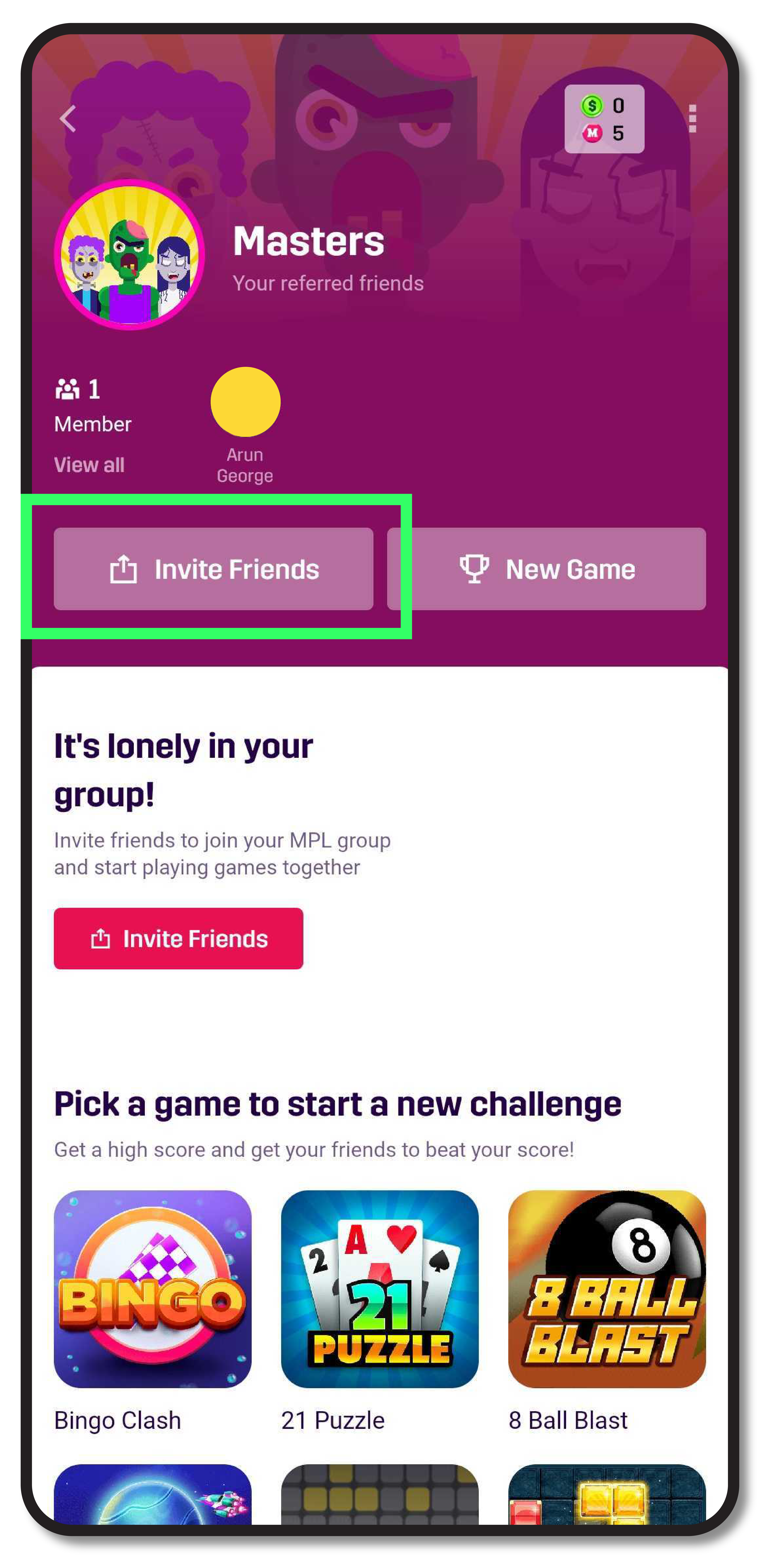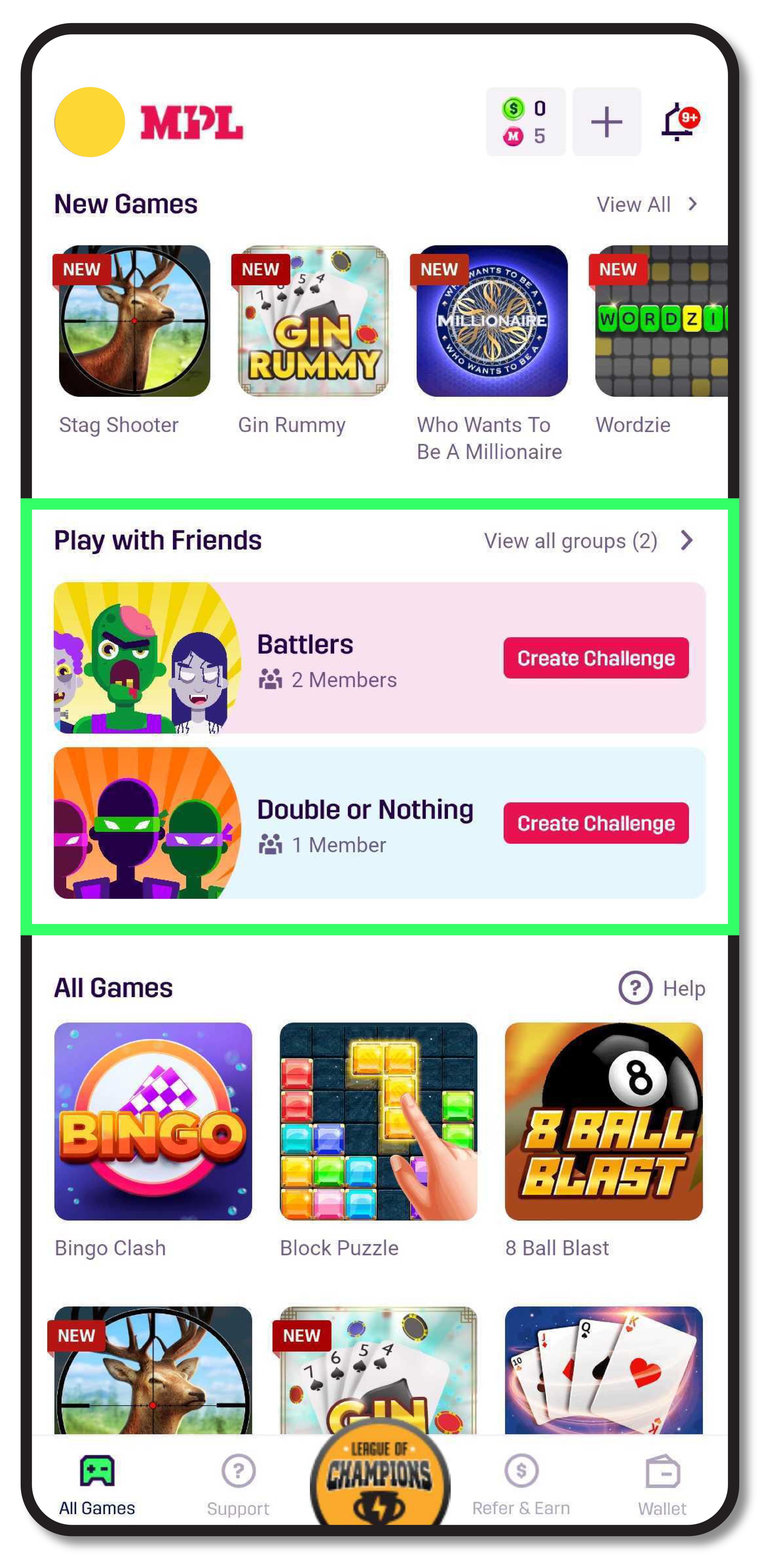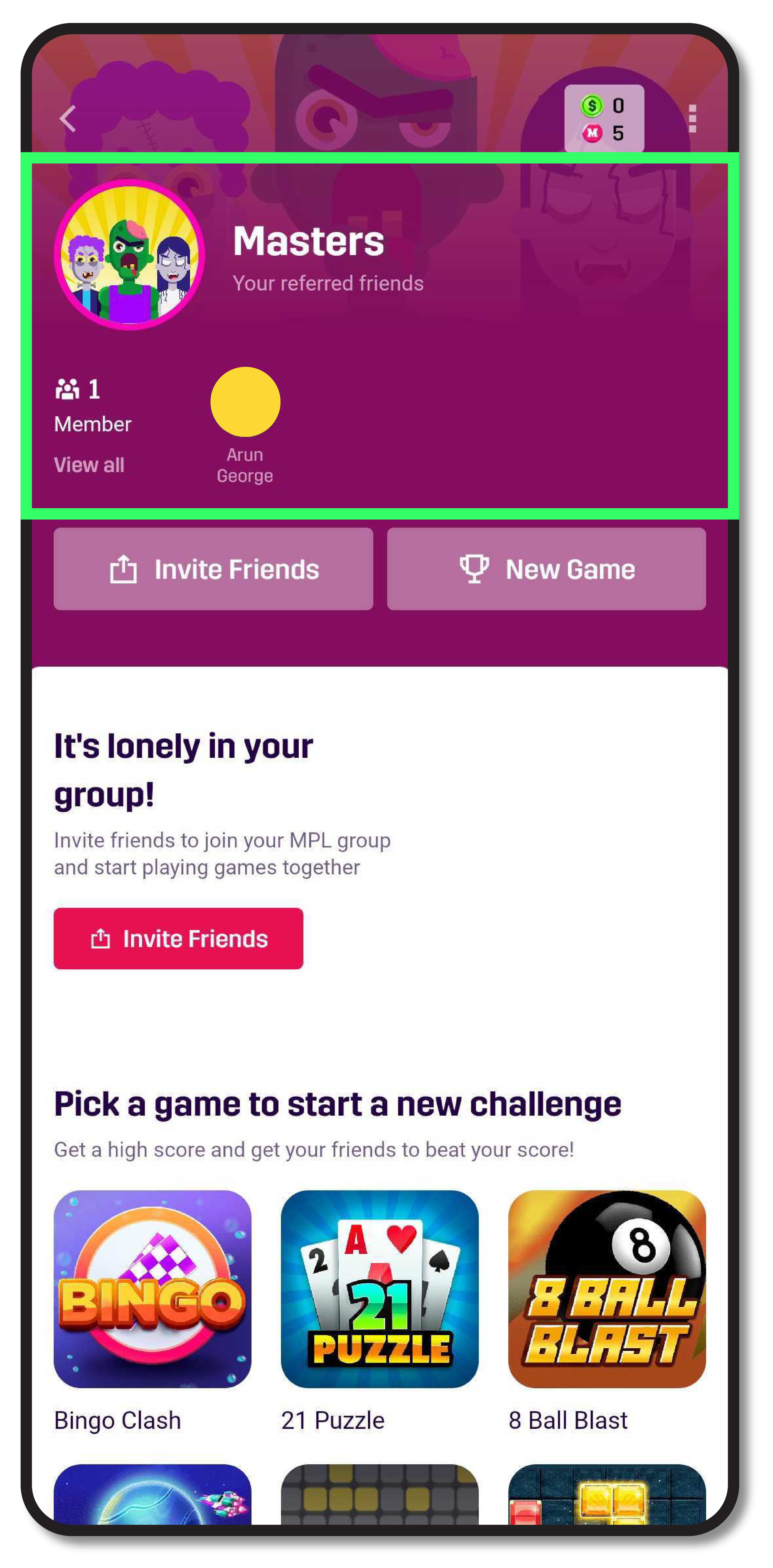 1. Play with Friends: Now, let your friends join in on the action by creating groups and inviting them to join via text, email, or other communicative apps. It doesn’t matter whether they’re already an MPL user or not. This group can act as a private space where you can compete with the best of your gamer pals and find out who’s the ultimate winner. You can currently use this to compete with your friends in 8 Ball Blast, Bingo Clash, Pinball, Wordzie, and 21 Puzzle. Find this unique feature in the app dashboard, usually a couple of scrolls down. Run 24-hour challenges on games and see who wins!