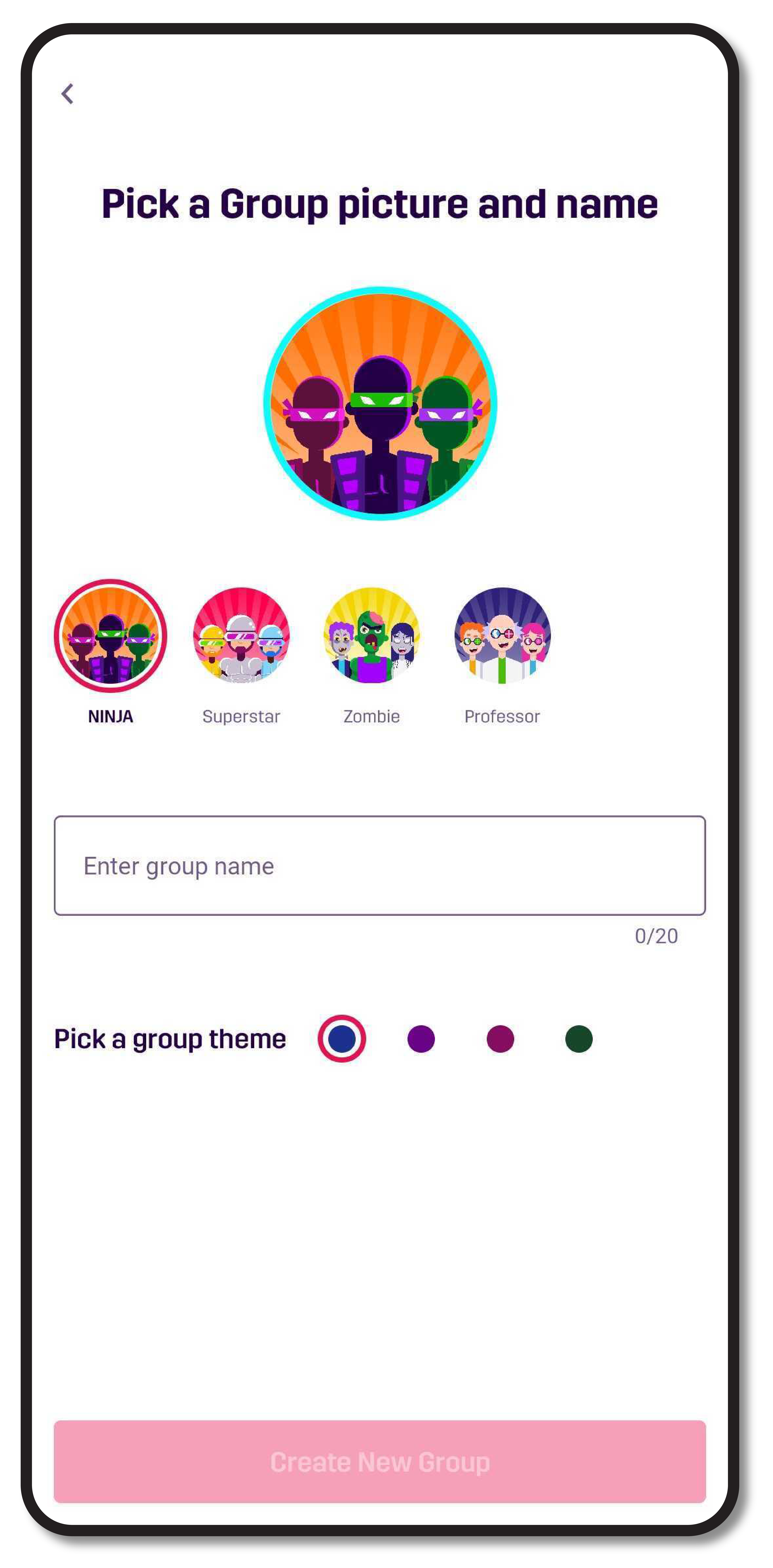 - Enter a group name (XYZ), select a picture, and a theme.