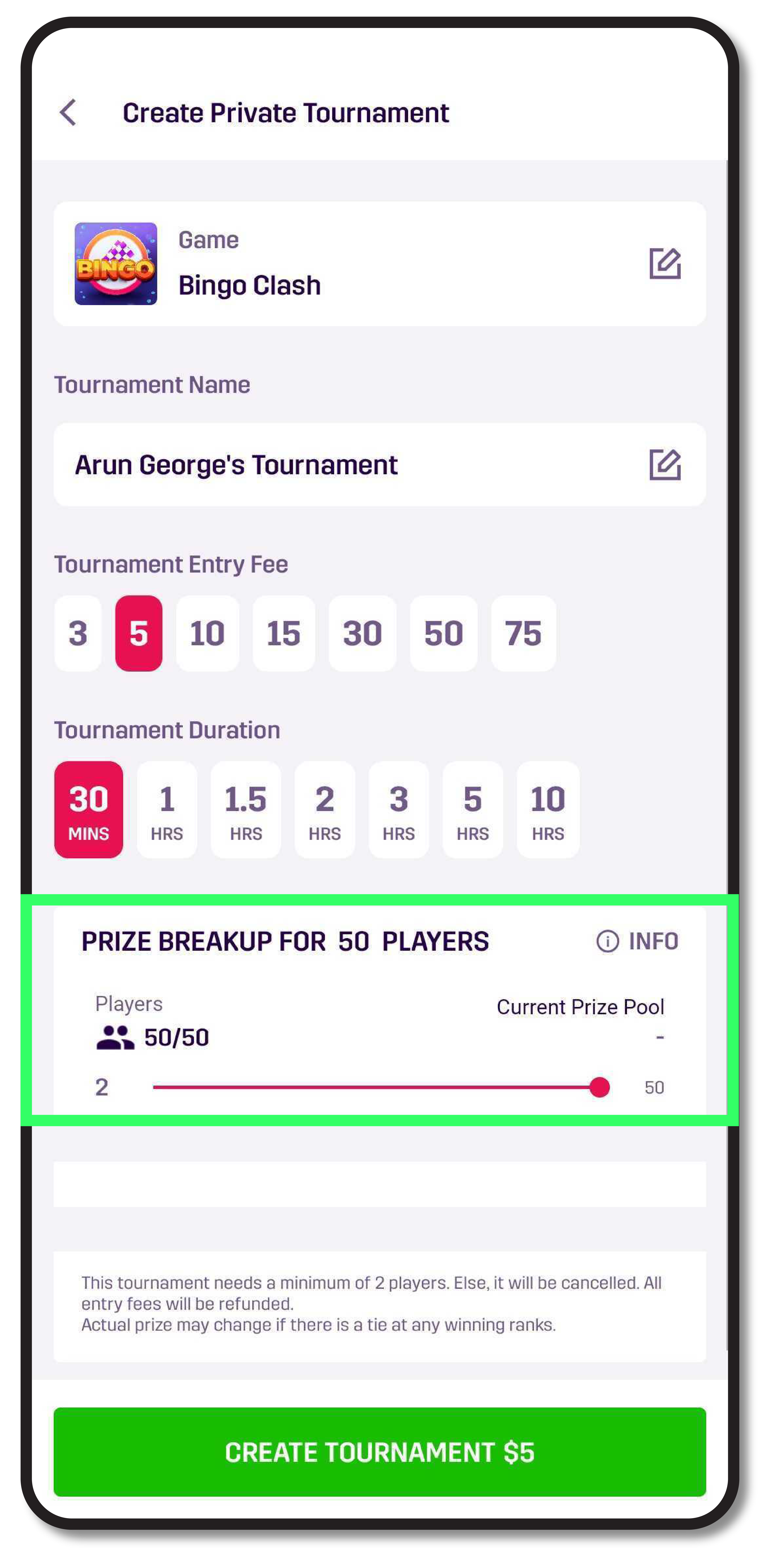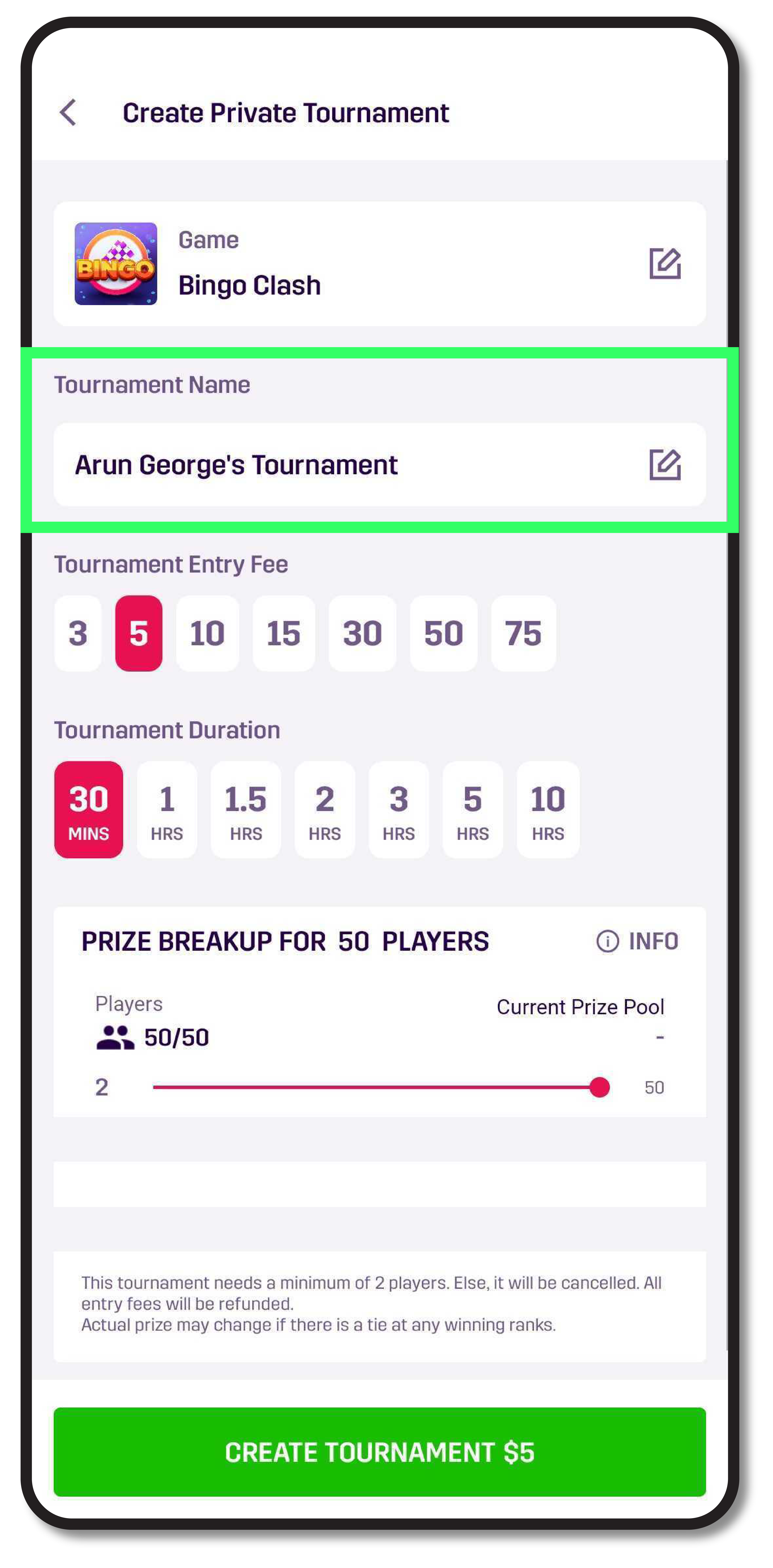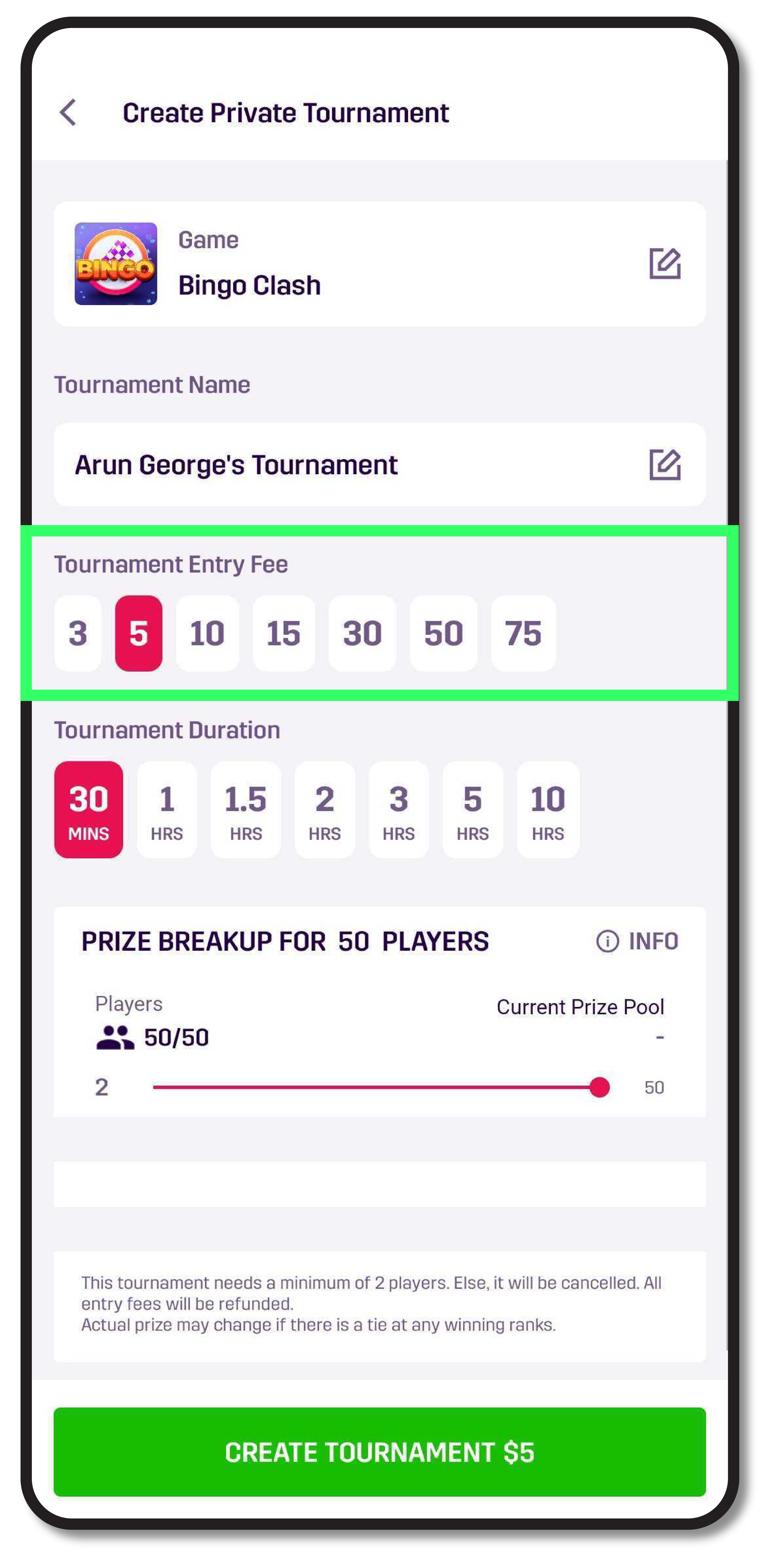 - Select the Tournament Entry Fee. Ranging between $3 – $75, you and each player who joins the tournament need to submit this fee.
