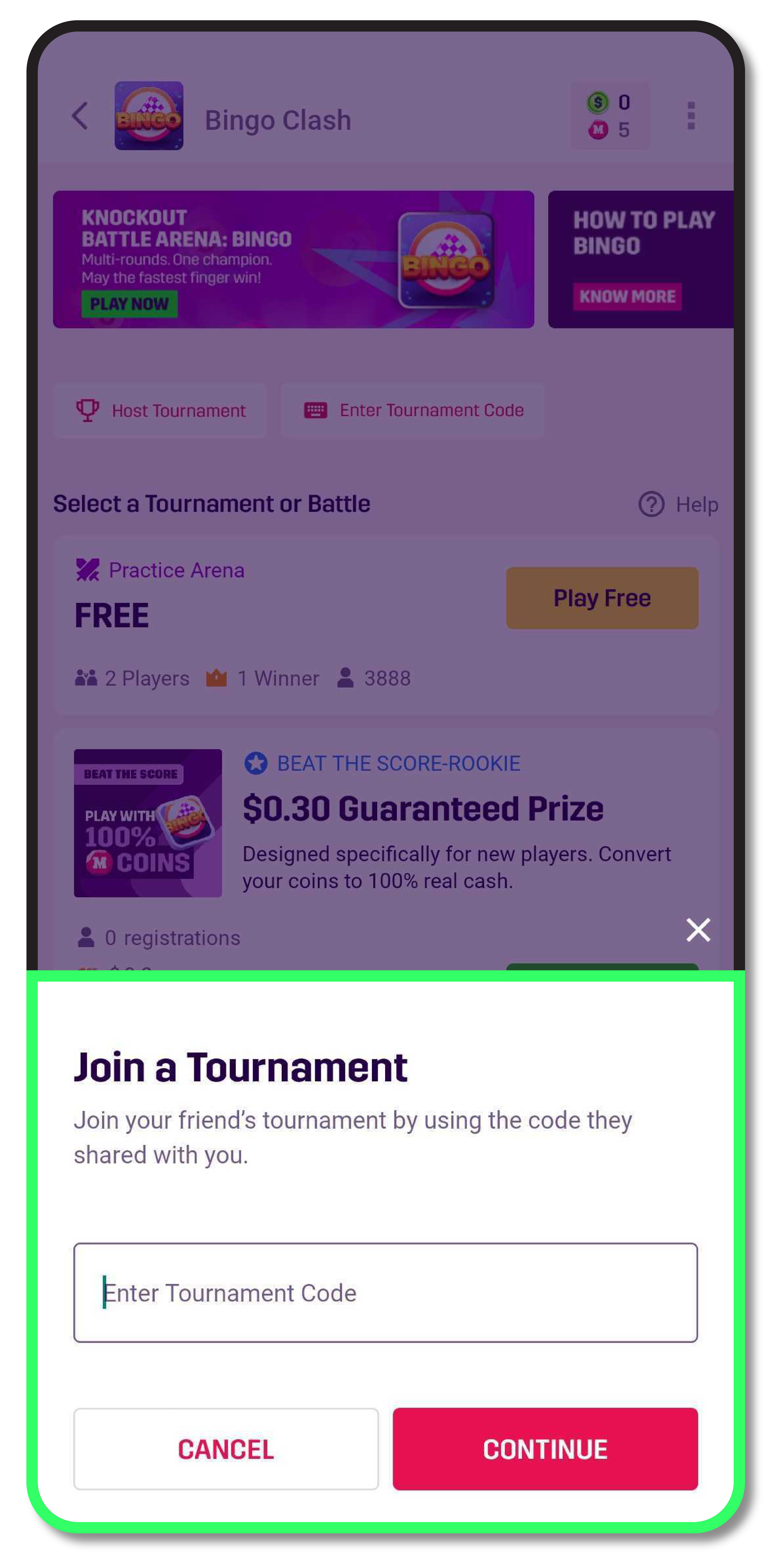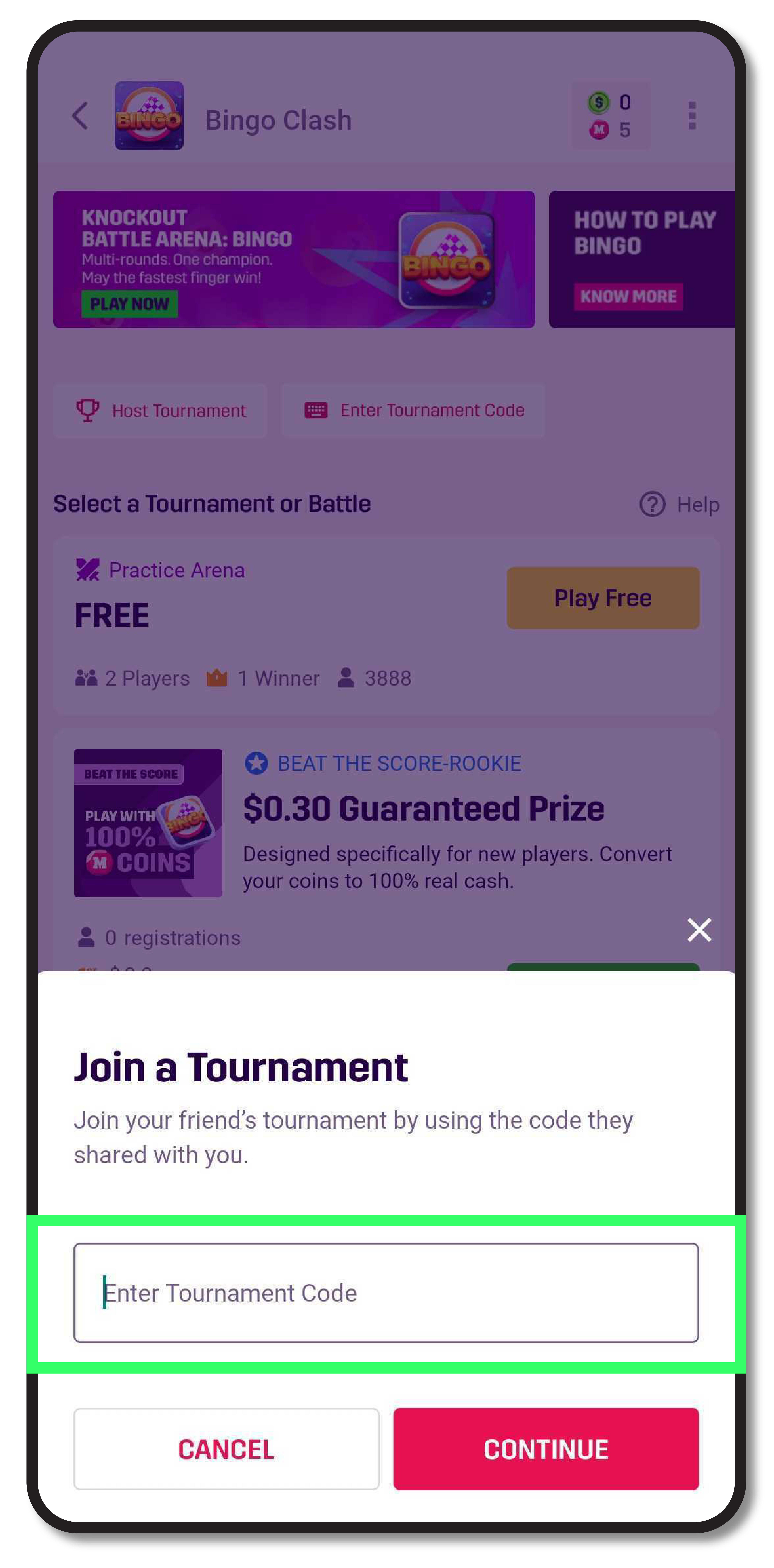 - Join your friend’s tournament by entering the code on the pop-up screen.